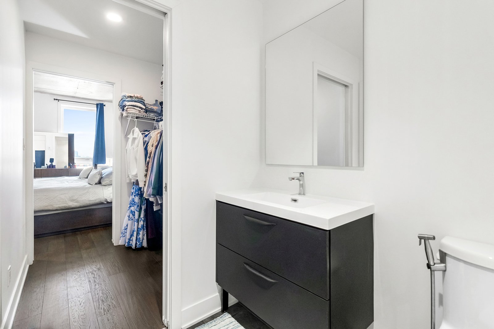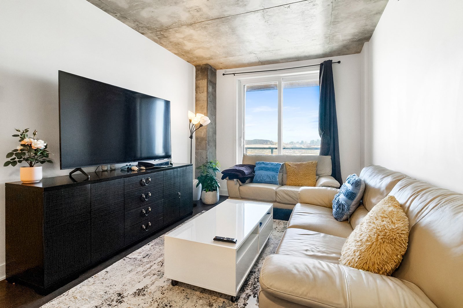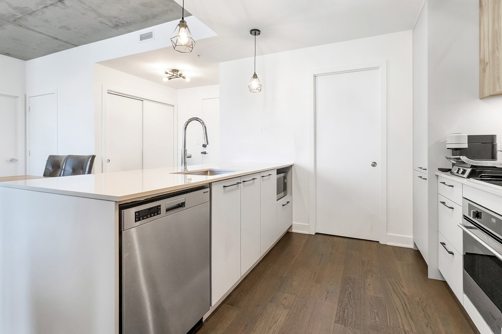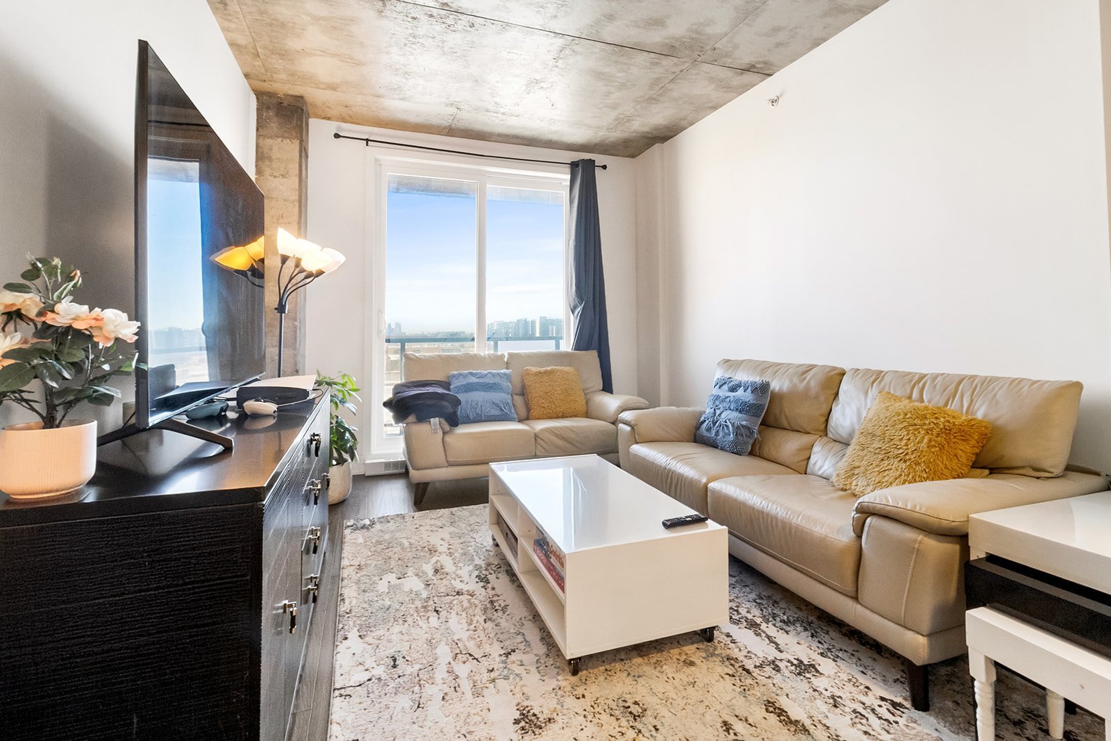L'unité actuellement louée pour 2300$/mois, propose deux chambres à coucher spacieuses, offrant une grande flexibilité d'aménagement selon les besoins : chambres familiales, espace de télétravail ou chambre d'invités. La salle de bains complète, bien aménagée, comprend un espace de lavage séparé, ajoutant un atout appréciable pour le confort et l'organisation au quotidien.